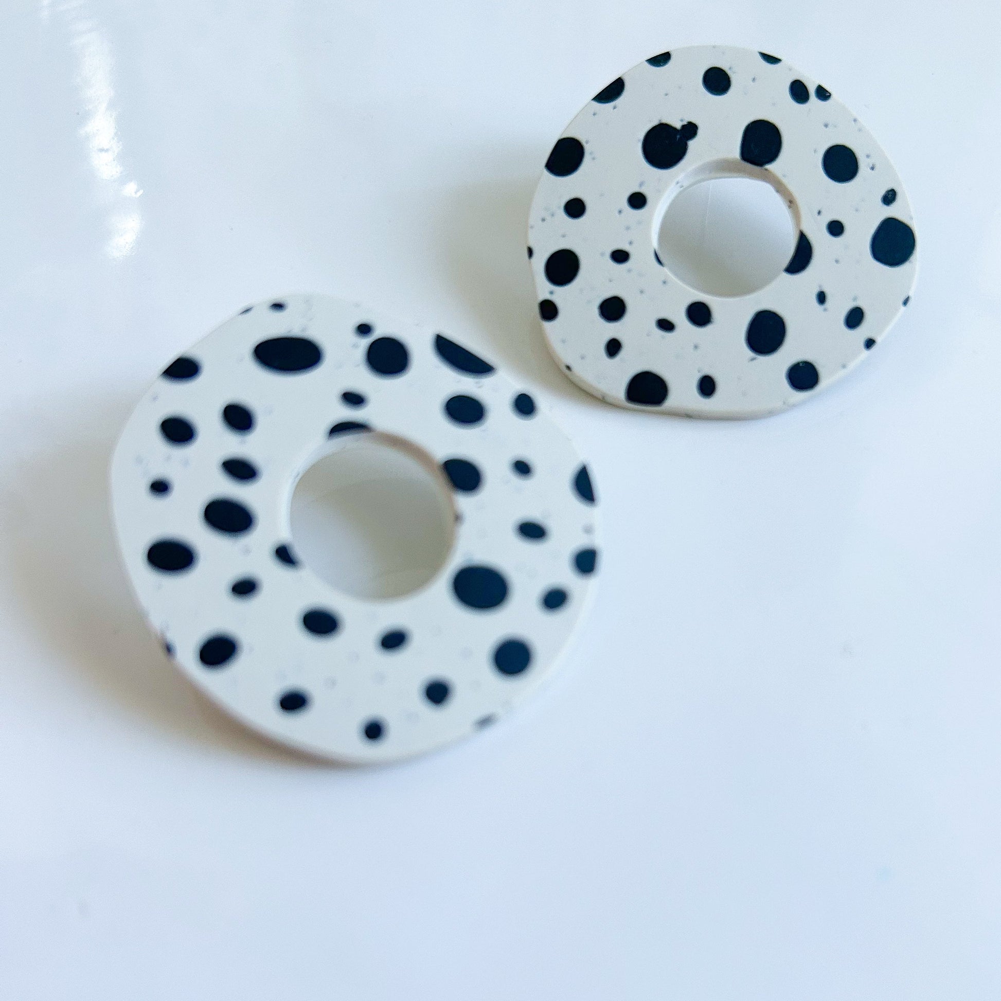 Add a pop of fun and sophistication to your look with these bold statement studs. Featuring a smooth ivory background adorned with playful black polka dots, these earrings strike the perfect balance between minimalist design and whimsical charm. Handcrafted from lightweight polymer clay, they offer a comfortable fit without compromising on style.