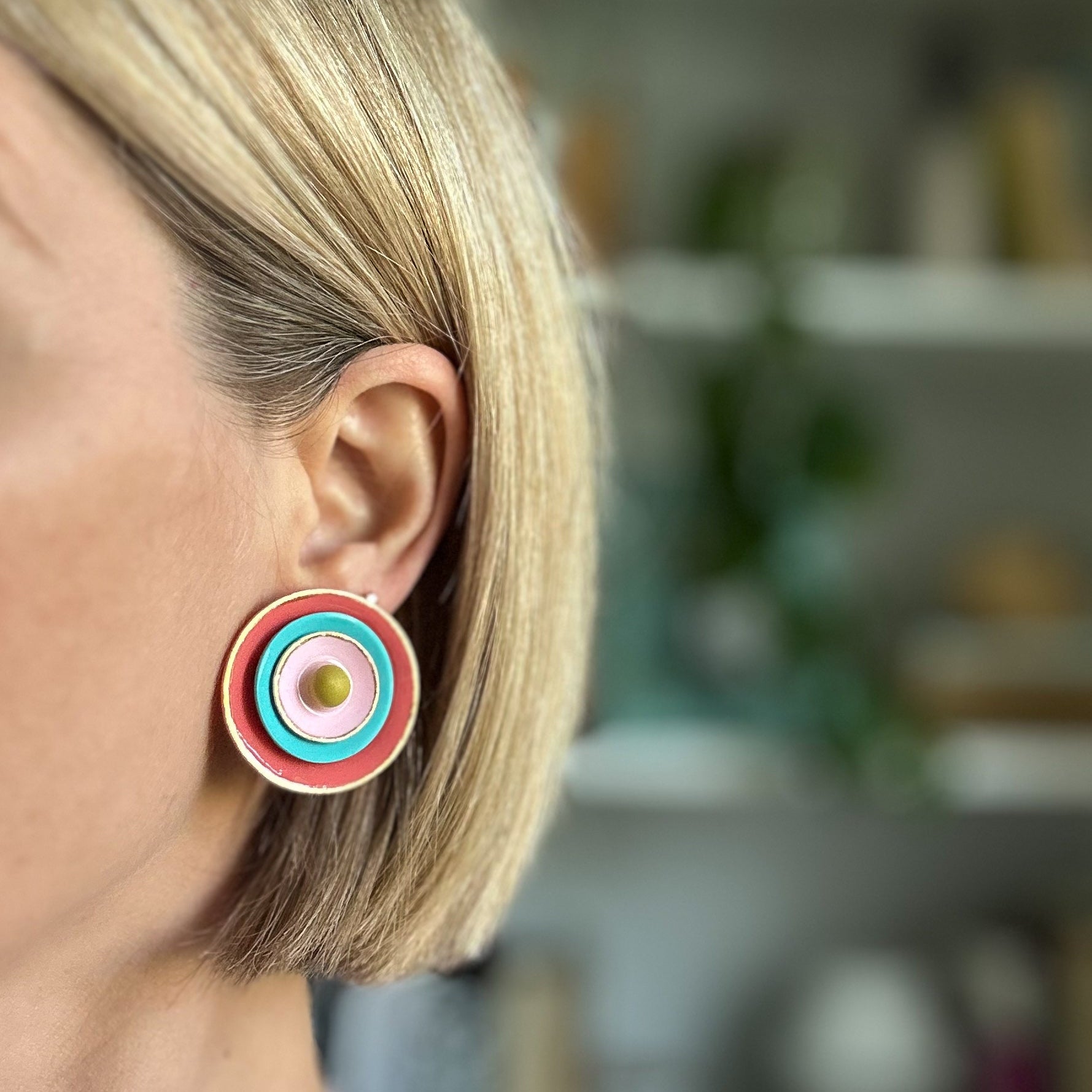 The multi-dimensional design creates depth and texture, while the vibrant, contrasting tones make each pair a true standout. Set on hypoallergenic titanium or gold-filled posts, they offer all-day comfort with a cosmic flair.